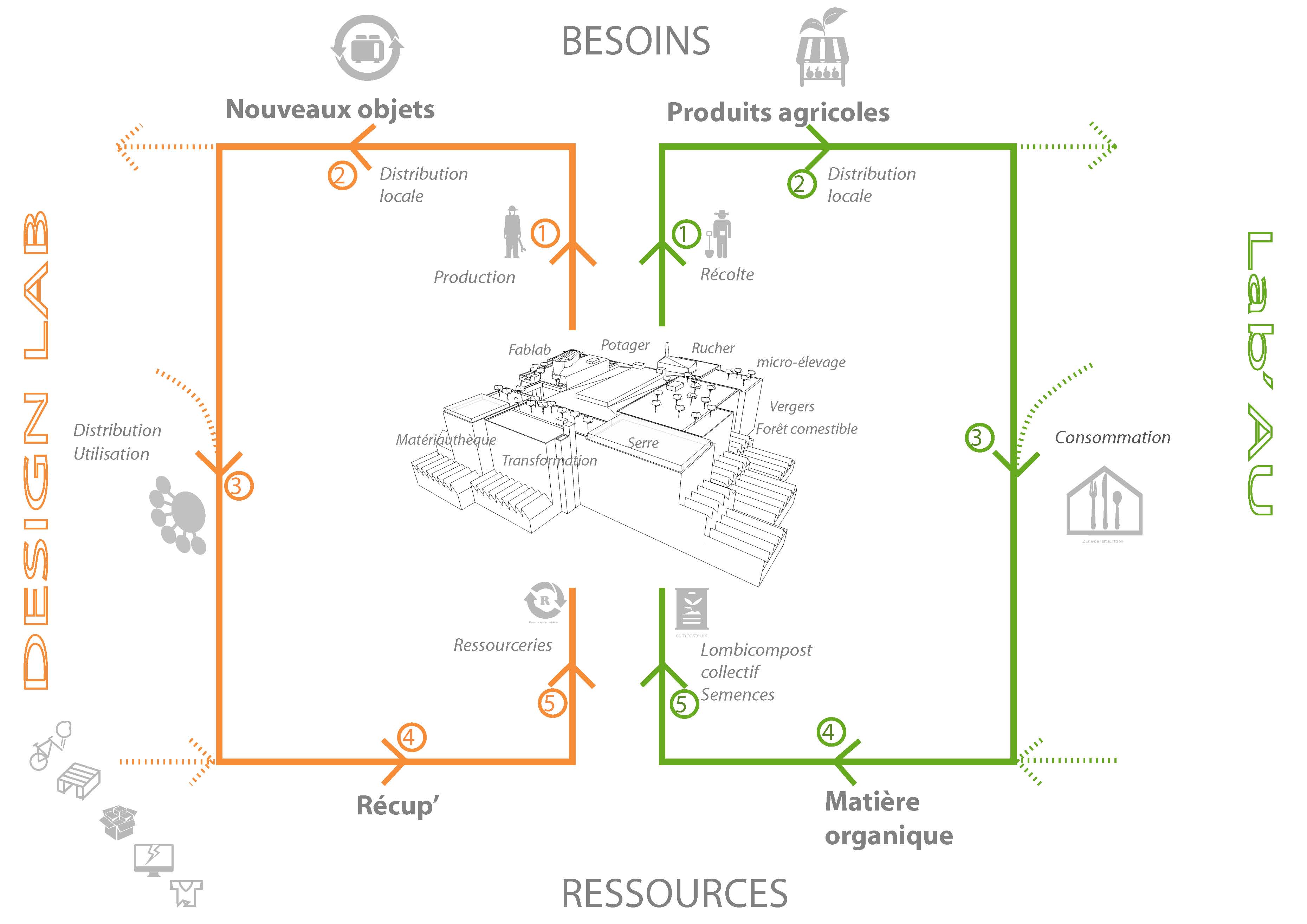 Un fonctionnement en double cycle, interconnecté par un Tiers Lieu (ici : le Mozinor) : le cycle de la Matière et le cycle du Vivant. Où les besoins sont assurés par la récupération et la transformation des ressources (déchets urbains) et leur distribution locale