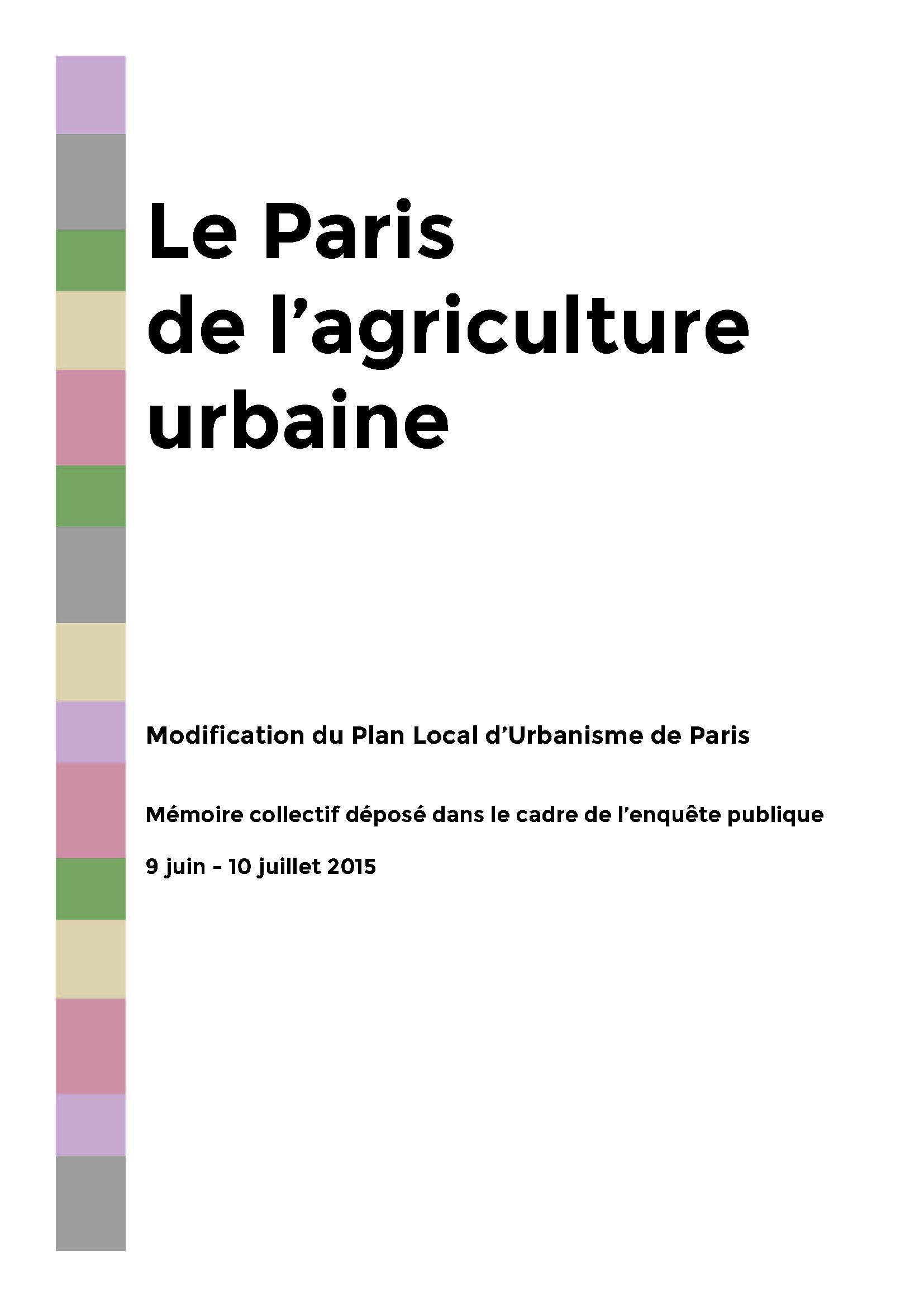 Ce rassemblement coïncidait avec le démarrage de la concertation parisienne portant sur la modification du Plan local d’urbanisme de Paris (PLU) qui interviendra en  2015. Loin d’être le simple fruit du hasard, le lancement de cette dynamique collective s’est inscrit dès le départ dans une volonté de porter un projet susceptible de faire de l’agriculture urbaine, un élément fort du futur PLU parisien. Très vite est apparu le souhait que ce travail se traduise sous la forme d’un mémoire versé à la consultation publique du PLU parisien. Six mois plus tard, le pari est devenu réalité. Pour y parvenir, nous avons choisi une démarche totalement ouverte, basée sur le dialogue et le débat en direction non seulement des élus locaux mais aussi de administration parisienne et des services techniques de la ville.