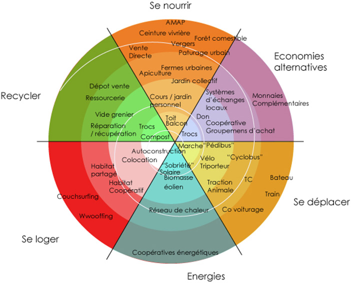 Le mouvement des villes en transition a été fondé par un professeur de permaculture, et est donc fortement lié à cette discipline. Ce mouvement, en plein développement (une trentaine de groupes en France, plusieurs dans l’agglomération parisienne), et s’appui ainsi sur des initiatives existantes tel que des jardins partagés, des Amap, etc., pour mobiliser habitants et bâtir une ville « post carbone ».